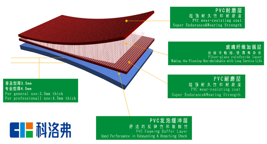 運動地板產品結構中添加了1000D的玻璃纖維補強網和特殊網格布纖維加強層,保證了本產品在運動過程中尺寸的穩(wěn)定性及牢固性,并起到了自動補強作用。